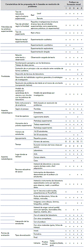 Las características de las propuestas se presentan teniendo en cuenta cuatro aspectos analizados: la naturaleza de las prácticas experimentales, las finalidades, los aspectos metodológicos y la evaluación. El anexo 2 muestra el consolidado de las características de las cinco propuestas de TPL.