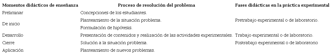 En la planeación de la enseñanza se distinguen momentos didácticos que buscan un aprendizaje efectivo en los alumnos y que requieren de una secuencia constituida por: preliminar, de inicio, desarrollo, cierre y aplicación. En una enseñanza basada en resolución de problemas en el laboratorio, cada momento didáctico se vincula según el proceso de resolución y las fases didácticas en la práctica experimental, como lo indica la tabla 1.