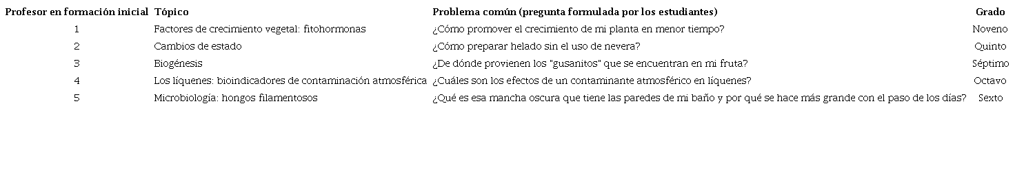 La tabla 2 muestra las cinco propuestas de trabajos prácticos de laboratorio basados en resolución de problemas, diseñadas y aplicadas por los profesores en formación inicial. Se indica el tópico, el problema común derivado de los intereses de los estudiantes y el grado escolar.