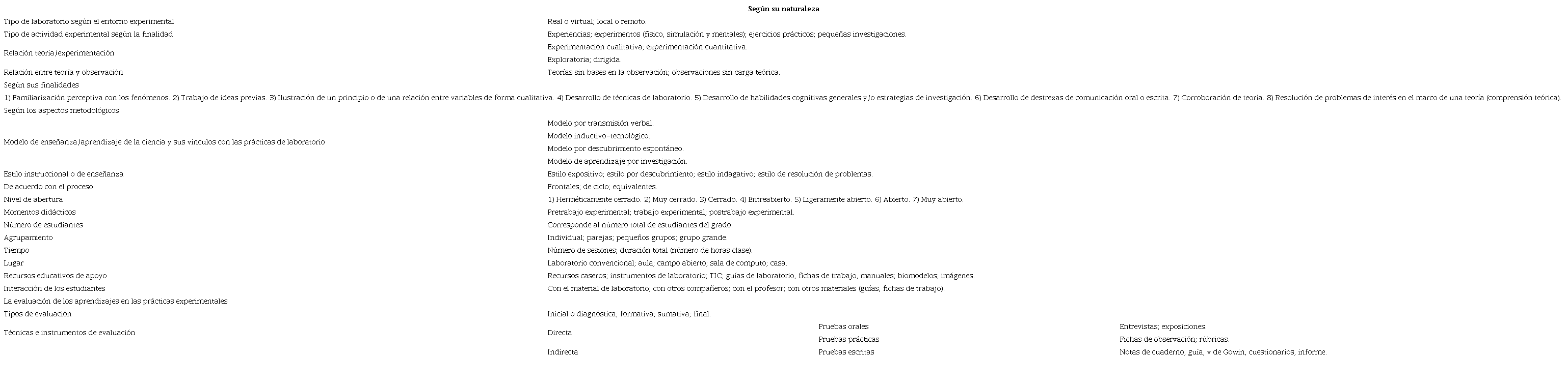 Es importante distinguir la diversidad de los TPL dado que "un amplio entendimiento de los fines de las prácticas requiere una clarificación del significado de los varios tipos de actividades prácticas, que son diferentes en naturaleza y pueden ser empleadas en distintas formas y utilizadas para lograr diversas metas" (Miguens y Garret, 1991, p. 229). Por ello, se plantea una caracterización (anexo 1) obtenida de aportes de diversos autores en estudios sobre las prácticas experimentales en la enseñanza de las ciencias naturales, de acuerdo con cuatro aspectos según: a) su naturaleza (Calvo et ál., 2008); b) las finalidades y objetivos que se pretenden (Caamaño, 2004); c) los aspectos metodológicos (Ariza de la Hoz, 2010; Dommin, 1999; Ferreirós y Ordoñez, 2002; Iglesias, 2004; Jiménez et ál., 2006; Marín, 2010); d) la forma de evaluación en el laboratorio (Puentes, 2008; Tortajada y Noguera, 2013).