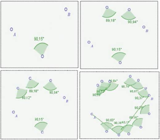 Finalmente, se les propone que escriban un mensaje para que una persona que no conozca la construcción pueda lograr que los veinte puntos cumplan la condición de que el ángulo APB mida 90 °.