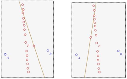 ABPLa construcción aproximada de la recta sirve para verificar la conjetura hecha por los estudiantes: efectivamente, parece que todos los puntos que cumplen aproximadamente la propiedad están sobre una recta.