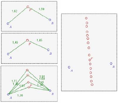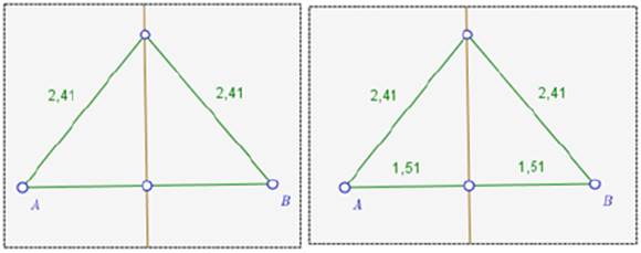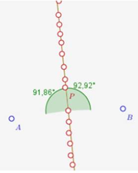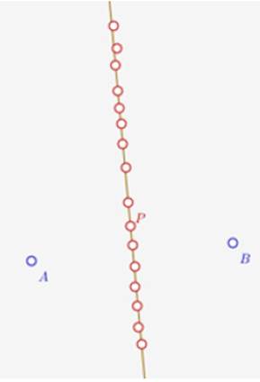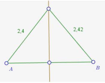 Si los estudiantes realizan una construcción perceptiva; es decir, ubican de manera perceptiva el punto medio del segmento AB y la perpendicularidad, el profesor les solicitará que construyan un punto sobre la recta y midan la distancias AP y PB. Como es muy probable que estas medidas no sean iguales, el profesor preguntará si es posible lograr que las medidas sean congruentes y se mantengan al arrastrar los puntos A y B.