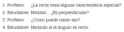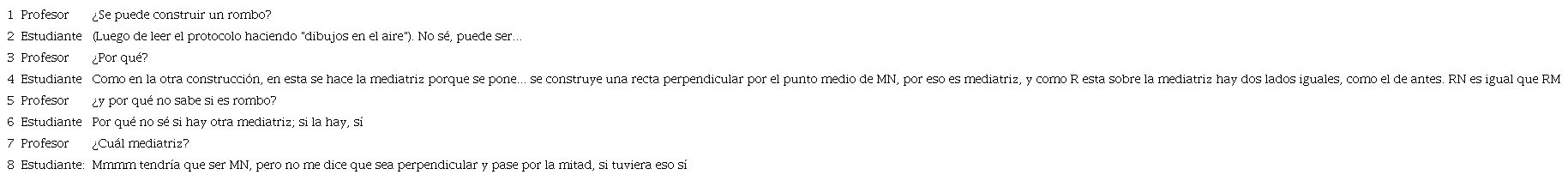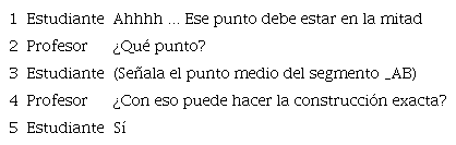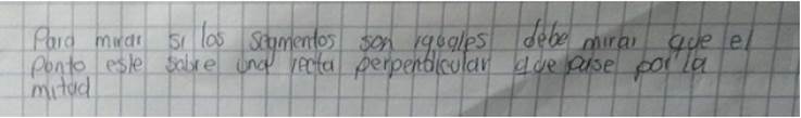 Se observa que el estudiante no hace referencia al objeto geométrico mediatriz, sino alude a las propiedades de este, razón por la cual el profesor institucionaliza el concepto, solicitándole al estudiante que reescriba el mensaje en términos de la mediatriz (Figura 17).