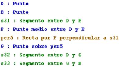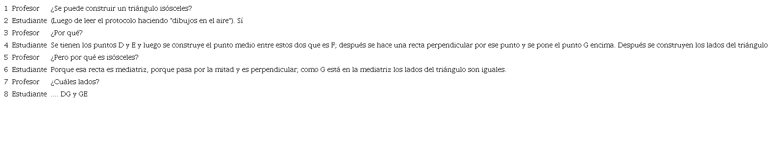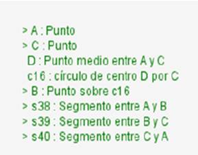 Después de realizar actividades de verificación y anticipación, se les propone a los estudiantes el siguiente protocolo de construcción, preguntándoles si con este es posible construir un triángulo isósceles (Figura 18 y Tabla 7).