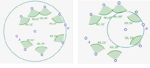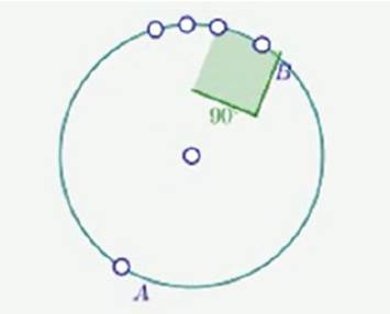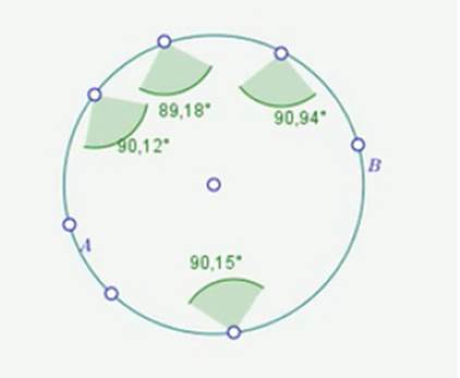 Si los estudiantes realizan una construcción perceptiva; es decir, ubican de manera perceptiva el centro de la circunferencia, el profesor les solicitará que construyan un punto sobre la circunferencia y midan el ángulo. Como es muy probable que la medida de ese ángulo no sea exactamente 90 °, el profesor preguntará si es posible lograr que la medida sea exactamente 90 ° y se mantenga al arrastrar los puntos A y B.