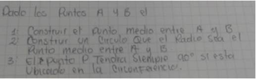 Se espera que digan que el ángulo APB siempre es recto sin importar que los puntos A y B se muevan; en este punto de la actividad se espera que identifiquen la diferencia entre una construcción exacta y una aproximada, ya que al realizar el hilvanado la construcción no conserva las propiedades, mientras que en la segunda, la construcción cumple con las condiciones a pesar del arrastre.