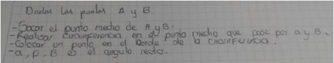 Los estudiantes concluyen de manera correcta que el triángulo ABC es rectángulo en B; hay evidencia de que los estudiantes conocen las condiciones del HG, específicamente la pertenencia del punto B a la circunferencia; sin embargo, es posible que los estudiantes no hayan utilizado un razonamiento deductivo, sino solamente una comparación del protocolo dado con el protocolo producido por ellos. Es decir, no necesariamente utilizan el HG como permiso para inferir, verificando el cumplimiento de las condiciones necesarias y suficientes.