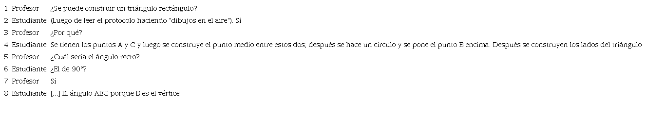 Y se les pidió que dijeran si el polígono ABC es un triángulo rectángulo, sin realizar la construcción. Los estudiantes realizan "dibujos en el aire" de la información presentada en el protocolo; afirman que con el protocolo entregado sí es posible construir un triángulo rectángulo (Tabla 2).