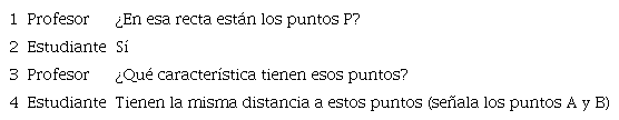 Cuando los estudiantes terminan de ubicar los puntos P con las características solicitadas, el profesor interviene preguntándoles sobre las características de esos puntos (Tabla 3).