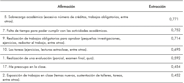 Esta categoría agrupa principalmente las actividades propias de las diferentes clases con "la preocupación de los estudiantes", estas se presentan en la tabla 4. Las afirmaciones con mayor índice de extracción es la "sobrecarga académica", con una media de 7,420, y la "falta de tiempo para poder cumplir con las actividades académicas", con una media de 7,470; la "realización de una evaluación", con una media de 6,500, y la última: "exposición de trabajos en clase", con una media de 5,690. Los datos anteriores tienen una media significativa, toda vez el conjunto de actividades de las asignaturas se agrupan con "la preocupación en la clase", con una media de 5,770.