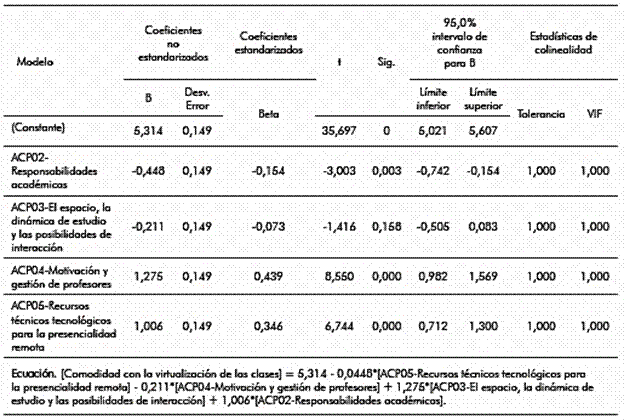 a Predictores: (Constante), ACP05-Recursos técnicos tecnológicos para la presencialidad remota, ACP04-Motivación y gestión de profesores, ACP03-El espacio, la dinámica de estudio y las posibilidades de interacción, ACP02-Responsabilidades académicas. b Variable dependiente: "Me siento muy cómodo con la virtualización de las clases".