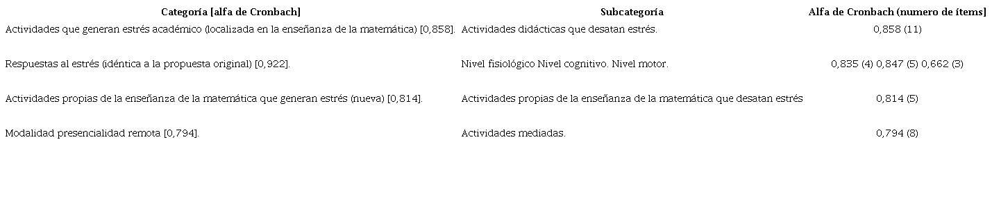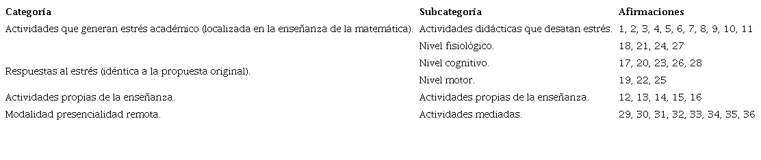 Para el establecimiento de la categoría de mpr se hizo una revisión de los modelos de tutoría virtual, se entrevistó a 3 estudiantes, se construyeron los ítems, los que se enviaron a pares y expertos, posteriormente, se hizo una prueba pilotaje cuya confiabilidad fue de 0,901. En la tabla 1 está la estructura del inventario de estrés académico aplicado. Cada afirmación se valoró entre 1 y 10, donde 1 es "Nunca o no le produce estrés" y 10 es "Siempre o le produce total estrés".
