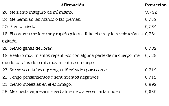 La tabla 3 contiene las afirmaciones que se agrupan en esta variable. El alfa de Cronbach es de 0,927. Cuando una persona presenta alguno de los síntomas se supone que está en el estado de alerta o de resistencia, toda vez que se ven activos el sistema fisiológico, motor y cognitivo. Si bien el orden de representatividad en el modelo cambia frente a otros estudios (Suárez et ál., 2019; Suárez, Hurtado et ál., 2020), se precisa indicar que se siguen agrupando y se ajusta fuertemente a la categoría a priori definida en el IEA.