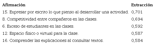 La tercera variable agrupa 5 afirmaciones, la primera con mayor índice de extracción es la de "expresar por escrito lo que pienso al desarrollar una actividad" con una media de 3,950, aparece asociado el "espacio físico o virtual para la clase" con una media de 4,890. La tabla 5 sintetiza las afirmaciones que hacen parte de esta variable.