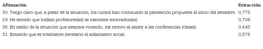 Pensarse la transformación del profesor en la presencialidad a profesor virtual, específicamente a profesor en la MPR, exige reflexiones y alternativas propias del entorno y las actividades. La tabla 6 contiene las afirmaciones que se agrupan en esta variable. La afirmación que mayor factor de extracción tiene es "tengo claro que, a pesar de la situación, los cursos han continuado la planeación propuesta al inicio del semestre", con una media 7,130, seguida de "he sentido que los(las) profesores(as) se mantiene motivados(as)", con una media de 5,990.
