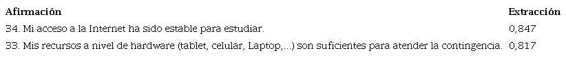 La MPR demanda el hardware necesario y pertinente junto con la conectividad estable para poder mantener el tiempo de conexión que en algunos casos equivale al mismo tiempo de la presencialidad, es decir que, si un estudiante tiene 18 horas semanales de clase, en la modalidad presencial, la institución y sus profesores ejecutan 18 horas de transmisión por Internet en la denominada MPR. En la tabla 7 están las dos afirmaciones que se agruparon en esta variable.