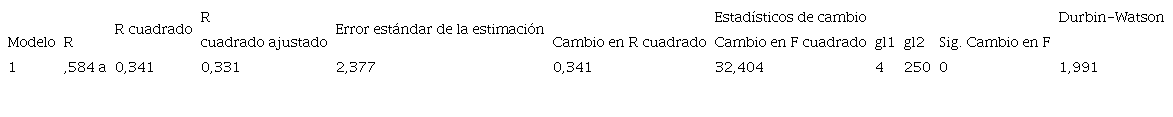 En el modelo se observan coeficientes de colinealidad aceptables (tabla 9, "estadísticas de colinealidad). Así mismo, se identifica la independencia de los residuos con índice Darwin-Watson (DW = 1,991). Con los coeficientes obtenidos en la tabla 9, así como el cumplimiento de los supuestos, se construye la ecuación con el peso de cada variable en la predicción de la comodidad de los estudiantes en la virtualización de las clases. Es necesario precisar que la afirmación se presentó de esta manera para referirse a la MPR con ocasión de la pandemia covid-19.