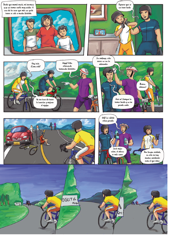 Por otra parte, las diferencias más notorias fueron la cantidad de información y contexto que se da en la animación respecto a la historieta, pues al ser la historia narrada, no escrita, se pudieron incluir muchos más detalles, sin necesidad de extender el tiempo de interacción con la narrativa. Otra diferencia notoria fueron los enfoques de musicalización y transiciones entre escenarios, que por la naturaleza de la animación son más agradables a la vista de los estudiantes. Por último, conceptos como velocidad, fuerza o equilibrio son más fáciles de evidenciar en una animación que en una historieta, pues se pueden lograr mediante transiciones rápidas de fotogramas o acercamientos y movimientos particulares del ciclista, lo cual en una imagen estática sería prácticamente imposible de lograr.