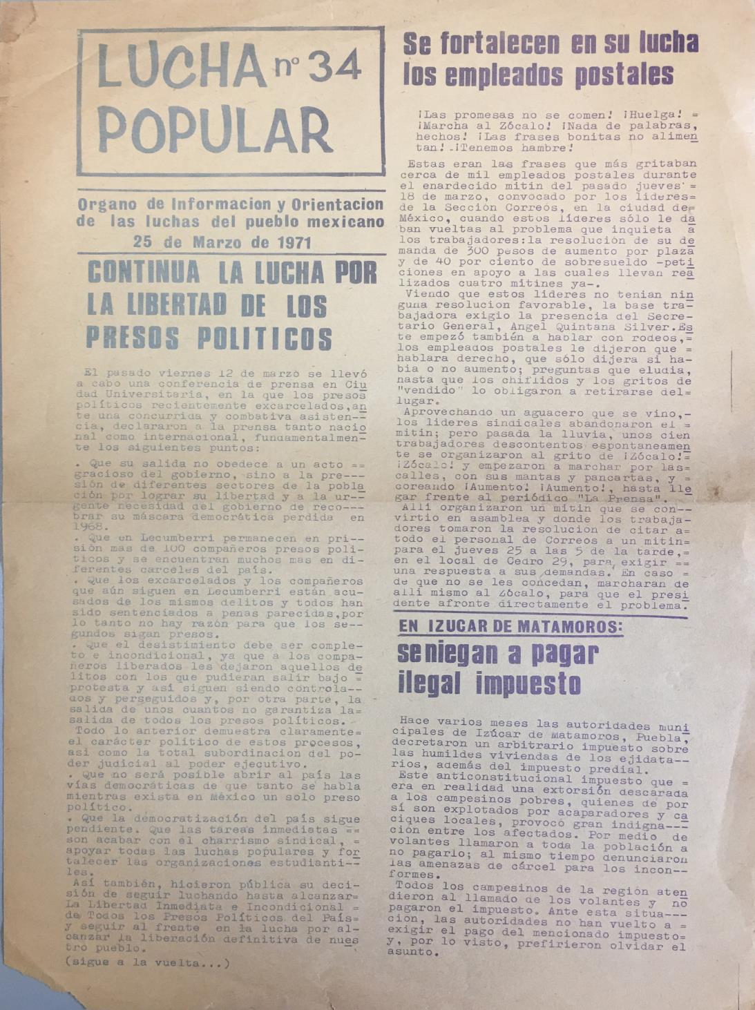 Así, para el principio de la década de 1970, se dio un cambio de rumbo para este grupo de la extinta Liga Comunista Espartaco y comenzaron a centrarse en los temas agrarios y campesinos vinculándose con otras organizaciones del mismo tipo como Política Popular, que tenía presencia en la zona de la Laguna y Monterrey. Con ellos lanzaron un semanario informativo llamado Lucha Popular que “llegó a tener cinco mil ejemplares” con una amplia circulación en varios estados donde se habían formado colonias populares. La publicación en extremo sencilla (imagen 3) en su formato, lo que para García Jiménez la hizo muy exitosa. Él estaba a su cargo “de sus textos breves e ilustraciones” junto con Rosalinda Monzón y Tatiana Coll, haciendo de esta publicación una “experiencia exitosa de información escrita para las masas”.23