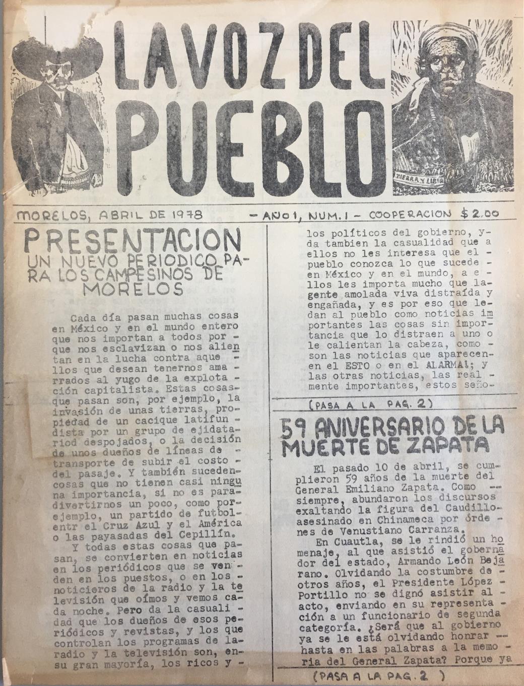 Su carácter urgente y efímero las hace imposibles de conseguir como colecciones robustas, no obstante, son suficientes para extraer algunas reflexiones sobre la militancia de izquierda, la relación con “las masas”, el pueblo y el uso de los impresos. Ya en 1978, en una situación menos precaria en su seguridad personal, vinculado con antiguos zapatistas, con el hijo menor de Zapata, organizando la Coordinadora Nacional Plan de Ayala, publicó La Voz del Pueblo (imagen 4). Fue un periódico para los campesinos en Morelos, una alternativa para obtener información en un momento histórico en México en el que hubo poca libertad en medios de comunicación, sobre todo fuera de la ciudad de México. En él se habla todavía de movilizar, pero también de educar y ahí me parece muy relevante la forma en la que estos movimientos, representados en gran medida en este ensayo a través de la experiencia y los recuerdos de una persona, que surgieron del comunismo se alimentaron también de otras perspectivas socialistas distintas a la comunista como la de Kropotkin, quien claramente propuso la educación del campesinado para poder entonces proceder a la lucha social o a la revolución social. En La Voz del Pueblo se incluyeron datos históricos relevantes para el gremio, la zona, igualmente elementos de cohesión comunitaria como una entrevista con cortadores de caña en Huacalco, Morelos.