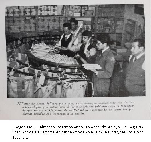 Tomada de Arroyo Ch., Agustín, Memoria del Departamento Autónomo de Prensa y Publicidad, México: DAPP, 1938, sp.Por supuesto, la infraestructura estatal no estaba diseñada para trabajar con estos niveles productivos, lo que provocó problemas de todo tipo. Tal vez por ello, los informes del DAPP destacaban la épica de todos los implicados, incluyendo algunos trabajadores como los almacenistas, que no suelen ser recuperados en las historias sobre el mundo editorial (Ver Imagen No. 3). Comprender cómo y con qué profundidad se vieron impactadas las formas de trabajo y la organización laboral de los productores de estos materiales, es algo que todavía requiere mayor exploración.