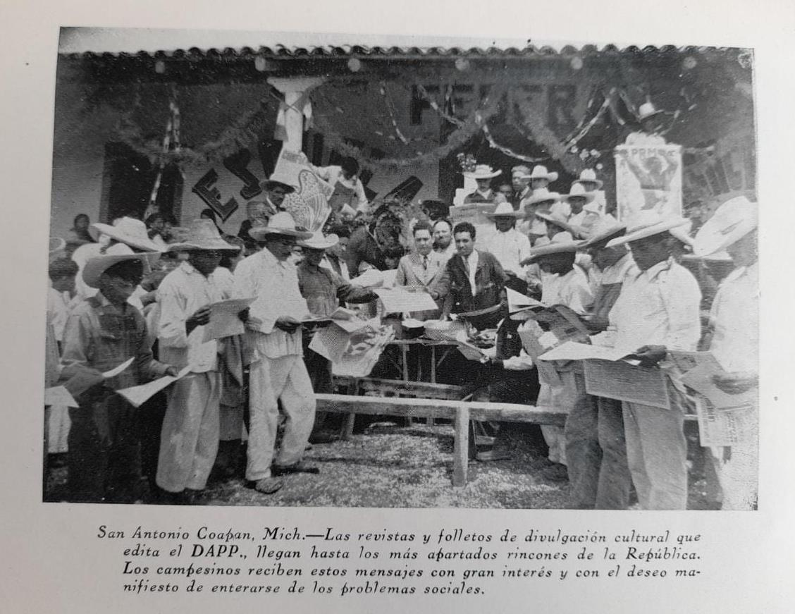 Por supuesto, en ambas representaciones, la de Tina Modotti y la del DAPP, no es el libro el que predomina el paisaje, sino que son otros formatos, sobre todo el periódico el que se muestra como el principal actor. En otras representaciones lo encontramos junto a la revista y también al folleto, pero escasamente son los libros el centro de estas imágenes. Como hemos visto a lo largo del presente artículo, son diferentes razones las que parecieran explicar esta situación. Sin embargo, es relevante mencionar que la crispación política que generó el periodo cardenista y la educación socialista, hicieron que estos formatos tuvieran una importancia trascendental. Los debates candentes rara vez circulaban a través de los libros. Eran los periódicos, y en muchos casos los folletos, los que se transformaron en lo que se ha llamado la literatura de actualidad, aquella que se esforzaba por conquistar espacios en el debate público.