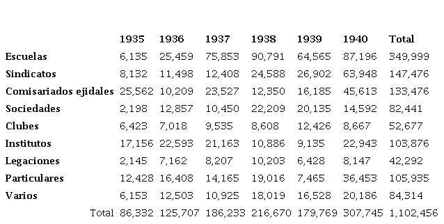 Otra forma de evaluar los meandros de estos procesos educativos y editoriales, consiste en detenerse en las donaciones de libros y folletos que realizó la SEP durante estos años. Como vemos en el Cuadro No. 1 si bien las escuelas fueron el principal objetivo, sólo recibieron un poco más del 30 por ciento de las donaciones. A los sindicatos, los comisariados ejidales e incluso organismos particulares se les entregaron una cantidad importante de ejemplares, dando cuenta de que la educación socialista envolvía una fuerte intención de impactar entre los obreros y campesinos. Por supuesto, en el caso de los ejidos y la reforma agraria en curso, en buena medida nos confirma la idea detrás del cardenismo de contemplar dicho proceso no sólo como la entrega de tierras, sino asociarlo a mejorar integralmente las condiciones de los campesinos.