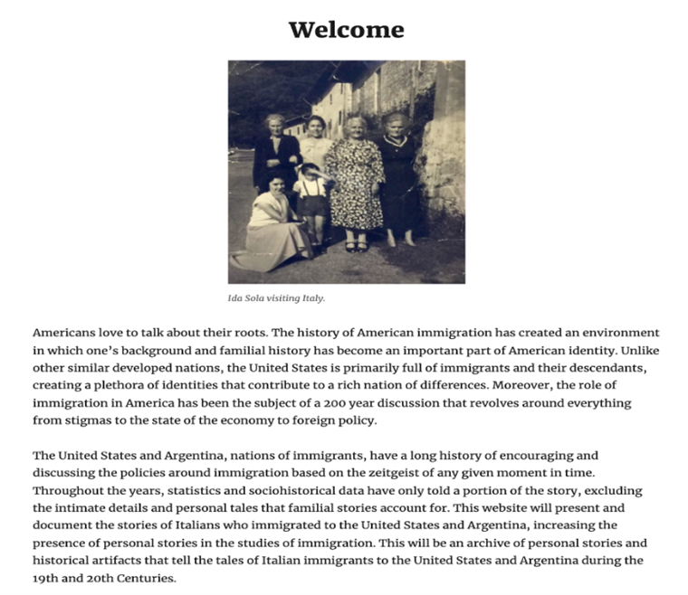 A lo largo de los meses, la idea original evolucionó a una página digital que no solo contara la historia de los Sola en Estados Unidos y en Argentina; se debía incorporar otras voces en los dos lados del Atlántico. Al mismo tiempo, el proyecto tendría más coherencia y significado analizando un periodo determinado con un corpus de estudio mayor; nos circunscribimos al período 1870-1914, la época de mayor afluencia de italianos a Argentina y a Estados Unidos, una etapa de crecimiento económico excepcional. Podríamos contrastar las experiencias inmigratorias en ambos lados del Atlántico durante un tiempo específico y con un cuerpo mayor de documentación. Como las experiencias y las decisiones de los inmigrantes fueron circunscritas por contextos específicos de tiempo, espacio y lugar, y estos contextos se estructuraron a partir de condiciones económicas, políticas y sociales específicas en dos lugares distintos del continente americano, sabíamos que la investigación sería ardua, y las similitudes y diferencias serían considerables.