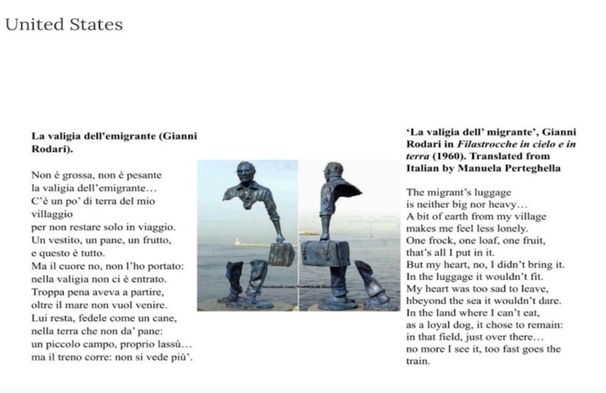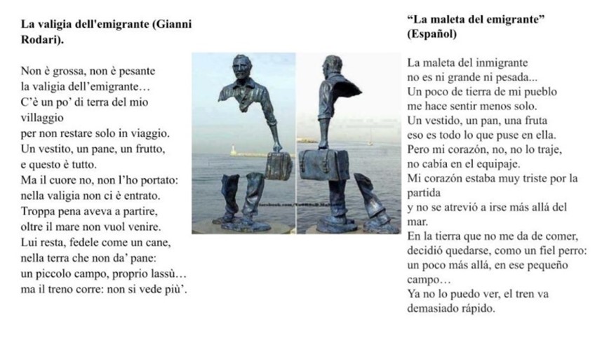 La página está escrita en español (imagen 4) y en inglés (imagen 5), porque estos son los idiomas de las sociedades que acogieron a los inmigrantes y son los idiomas de toda la documentación "oficial" de sus vidas. Incluimos, además, un poema en italiano llamado "La valija del inmigrante" y la escultura "El vacío del inmigrante/Los viajeros", de Bruno Catalano.