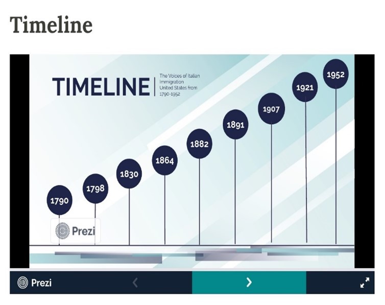 Para las líneas temporales de la inmigración en Estados Unidos y Argentina, experimentamos con colores y herramientas comunicativas. Finalmente, decidimos que Prezi —fácil de utilizar en cualquier idioma— sería la plataforma secundaria interactiva (imagen 3). En el futuro, Prezi será también utilizado para crear los árboles genealógicos.