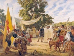 Uno de los aspectos más interesantes en la pintura de Pedro Subercaseaux es la primacía del género histórico, tradicionalmente considerado como la forma más elevada de la pintura debido a su carácter eminentemente pedagógico y moralizante, lo que se expresó en el desarrollo de obras en las que se narran episodios de la Conquista (imagen 4) e Independencia de Chile, así como también otros tomados de la hagiografía de algunos santos, entre ellos San Francisco de Asís y San Benito. Estos elementos han llevado a Gabriel Guarda a calificar a Subercaseaux como el “pintor de las glorias nacionales”,26 epíteto que parece excesivo, pero que da cuenta de la verdadera pasión del artista por la historia patria y el minucioso estudio de uniformes militares, armas y vestimentas del pasado.