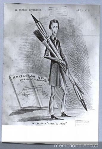 Antonio Smith, quien ha sido reconocido como el “primer caricaturista chileno”, comenzó a realizar ilustraciones satíricas para el célebre periódico El Correo Literario en 1858. Sin embargo, esta producción entre los historiadores del arte ha sido revisada de manera accesoria17 y desconectada de su obra pictórica, pues más relevante que su título como primer caricaturista es el haber sido el primer artista, formado en la escuela de arte local, que se dedicó a un arte considerado “menor”: la caricatura.18 Además de ello, Smith logró mediar y articular las lógicas productivas propia de las bellas artes, es decir, la obra “única, genial y aurática”, con el producto espurio, circunstancial y masivo que circulaba a través de la prensa periódica, para cuya realización se ponía en práctica la principal habilidad que se educaba en la academia, el dibujo.19 En otras palabras, Antonio Smith fue la primera figura que en Chile logró conciliar dos ámbitos creativos “contrapuestos” en los que logró ser igualmente reconocido. Este doble carácter de su obra —gráfica y pictórica— era reconocido por el propio artista, quien publicó un autorretrato caricaturesco en El Correo Literario en el que se representó portando un pincel y un lápiz litográfico acompañado por la leyenda “un artista ‘comme il faut’”20 (imagen 1).