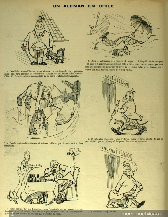 Respecto del argumento de “Las aventuras de Von Pilsener”, este refiere, en términos generales, a las peripecias vividas por el ingenuo y simpático sabio alemán Federico von Pilsener, quien, al modo de los exploradores decimonónicos, viajó a Chile junto a su perro salchicha llamado Dudelsackpfeifergeselle con el fin de conocer las costumbres de los “salvajes e incivilizados” habitantes del sur del mundo. Esta historieta, de acuerdo con Jorge Montealegre, se encuentra dividida en tres momentos: “Aventuras de un alemán en Chile”, “Von Pilsener en Alemania” y el “Regreso de Von Pilsener”.29 En relación con su contenido, es relevante señalar que este ha sido considerado más bien simplón; no obstante, creemos que es altamente crítico y contingente al igual que la tradición caricaturesca de la que es heredero. En este sentido es relevante el medio dentro del cual circuló: la revista Zig-Zag, cuyo público objetivo era la elite letrada, de manera que las denuncias hechas por medio de esta historieta buscaban interpelar principalmente a los sectores dirigentes, con el fin de que pudiesen corregir un conjunto de prácticas que, a ojos de Subercaseaux, en nada aportaban a la modernización e imagen de país “civilizado” que dicho grupo social propugnaba. El carácter altamente nacionalista y edificante de su gran obra pictórica también permeó sus viñetas.