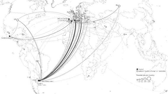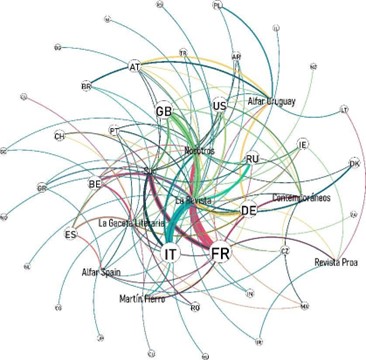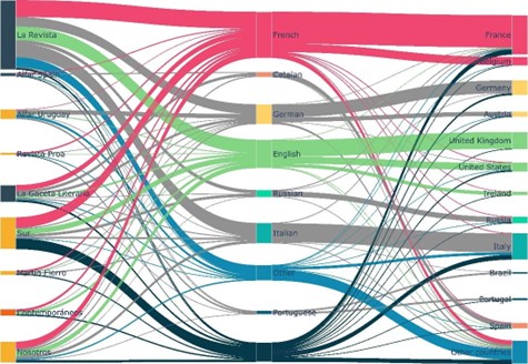 Para responder a estas preguntas con datos, trabajamos en la detección y análisis a gran escala de traducciones publicadas en revistas iberoamericanas que actualmente se hallan digitalizadas. A modo de ilustración sobre las posibilidades de este tipo de análisis, véase la visualización geográfica (Fig. 1) que muestra la procedencia de autores/as extranjeros/as publicados/as en una selección de nueve revistas de inicios del siglo veinte en México, Argentina, Uruguay y España. Una primera conclusión es que prevalece Francia como lugar de procedencia de autores/as importados/as en Iberoamérica. Si bien no es nada nuevo reconocer la francofilia en este espacio literario, sobre todo, en América Latina, la visualización nos permite llegar a esa conclusión a partir de la recolección de datos empíricos. Ahora bien, si nuestro interés no es tanto ubicar la posición geográfica de los países sino resaltar de un modo más abstracto el flujo de lenguas de intercambio, una buena herramienta para procesar estos datos es el Diagrama de Sankey (Fig. 2),28 que destaca el flujo que, en un mapa, quedaba opacado al colapsarse, por ejemplo, todos los nodos provenientes de Francia. Por último, otra forma de visualizar la misma información, pero haciendo hincapié ahora en el elemento relacional, es un grafo (Fig. 3). Esta figura vuelve a poner de relieve la centralidad del francés como lengua traducida, seguida del italiano, inglés y alemán. En síntesis, sea una visualización geográfica, en diagrama de flujo o relacional, la comparación de las imágenes obtenidas a partir de los mismos datos resulta útil para compensar posibles sesgos de las herramientas usadas.