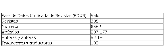 Como señalamos más arriba, las 5 fuentes seleccionadas tienen la ventaja de ofrecer índices del contenido de las revistas en formato digital, o bien como documentos en formato PDF o bien como listados u otros formatos en la página web. Tras la extracción, limpieza y procesamiento de estos índices, pudimos obtener los datos de los artículos presentes en cada número de las revistas; acción clave para poder detectar posteriormente las traducciones. Ahora bien, además de lo complicado -y muchas veces ingrato- que puede ser el proceso de limpieza de datos y modelado de las fuentes, huelga aclarar que cada fuente estructura su información de un modo distinto; por ejemplo, si bien todas informan título de artículo y autoría, no lo hacen bajo las mismas categorías. De ahí que el objetivo central de nuestro trabajo era, partiendo de una estructura heterogénea de datos, llegar a construir una base de datos unificada en la que cada artículo tuviera uno/a o más autores/as identificados/as. Esta estandarización de las 5 fuentes en una base de datos unificada de revistas (BDUR), construida en arquitectura relacional PostgreSQL, permite hacer consultas cruzadas de un modo mucho más rápido y fiable sobre obras, autores/as, traducciones y lenguas. Así pues, la BDUR reúne los siguientes ítems (véase Tabla 1).