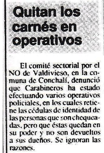 Una vez oficializada la nominación del candidato, el periódico dio cuenta de procedimientos que podrían hacer dudar de la correcta aplicación del proceso plebiscitario. El más claro ocurrió en los Registros Electoral y Civil, reparticiones en las que se hacían enormes filas para poder tramitar cédulas, lo cual no se podían llevar a cabo, ya que las personas afectadas denuncian ser víctimas de maniobras de obstaculización para no poder sufragar en octubre. Como lo aseveró una persona: “Fíjese que me tramitan porque quieren tramitarme nomás(…) Debo tener una cara de NO que no me la puedo”31. El dar a conocer este tipo de hechos, sería uno de los principales rasgos de la cobertura del medio en el período de campaña previo al referéndum como sucedió con la denuncia de que, en el marco de operativos policiales, personal de Carabineros estaba quedándose con cédulas de identidad de personas que eran sometidas a controles en Conchalí (zona norte de Santiago) (Figura 1)32. Este hecho no era menor, puesto que, para poder votar en el plebiscito, solo se podía concurrir con la cédula de identidad vigente y, al requisarla, se impedía a las personas afectadas concurrir a sufragar, considerando lo engorroso que podía ser sacar una nueva cédula. Desde la sección “Barrios y poblaciones” se denunciaba también que, durante la emisión de la franja electoral por televisión, algunas poblaciones sufrían cortes de electricidad.