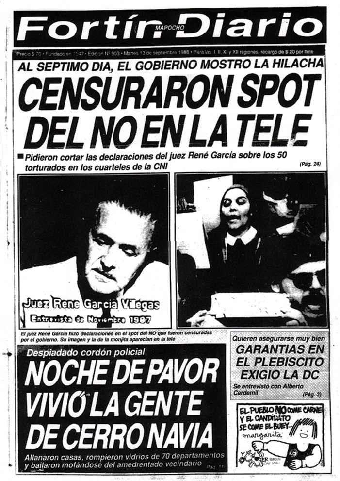 La postura opositora de Fortín Mapocho fue motivo para que no se permitiera el ingreso de sus periodistas a actividades oficiales, en el marco de la celebración de las Fiestas Patrias, tal como ocurriera en el Te Deum Evangélico, desarrollado el 17 de septiembre. Según la versión del medio: “Una vez más, Fortín debió conformarse con seguir la actividad del candidato único desde lejos. Fuimos al templo, pero nos encontramos con una actitud muy poco cristiana: ‘¿Fortín? No, no pueden entrar’”46. Un hecho similar había ocurrido días antes, cuando otro equipo del medio fue expulsado de una actividad donde participaba Pinochet en el Museo de Bellas Artes. En ese sentido, el diario también denunció el acoso y obstaculización del que eran víctimas otros medios opositores (revistas Análisis, APSI, Cauce y Hoy), cuyos periodistas enfrentaban procesos judiciales en aquel momento, con lo cual la supuesta flexibilidad prometida por el gobierno en la cobertura del proceso plebiscitario no se estaba cumpliendo.