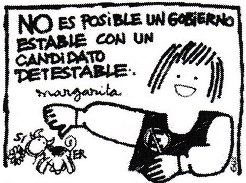 Así ocurrió en la edición del 30 de agosto, día en que la Junta de Gobierno debía dar a conocer el nombre propuesto para el próximo período. En el espacio, la protagonista de la caricatura señalaba: “Reunidos en el ConSIlio, cuatro conoSIdos deSIdirán lo que ya está coSInado” (sic)50. La forma de escribir las palabras “concilio”, “conocidos”, “decidirán” y “cocinado”, reemplazado las sílabas “ci” por “SÍ”, apelaba a un sarcasmo, frente a la previsible nominación de Pinochet. Una vez que se ratificó esto último, el tono del discurso de Margarita se enfocó en satirizar al candidato y a los sectores que constituían su base social de apoyo. En ese sentido, la caricatura del día 1 de septiembre decía que Pinochet “es candidato porque los ricos no pueden esperar”51, en una clara crítica a las políticas económicas y sociales adoptadas por el régimen, haciendo alusión a una frase dicha por el Papa Juan Pablo II en el marco de su visita a Chile, en la que señaló que “los pobres no pueden esperar”. En otra pieza, Margarita afirma que “NO es posible un gobierno estable con un candidato detestable”, apelando a la falta de legitimidad de Pinochet para ejercer la presidencia de la República (Figura 3).