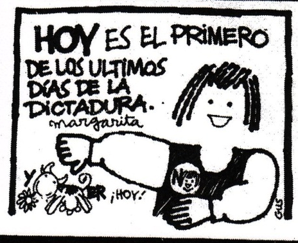 Con todo, podemos constatar que a viñeta fue usada para transmitir un mensaje optimista en torno al resultado del referéndum, algo que se mantuvo desde el inicio del período de campaña hasta el mismo día del acto plebiscitario. Concretamente, en la portada del 5 de octubre, Margarita señala que ese era el primero de los últimos días de la dictadura (Figura 4)57. Respecto de ello, podemos afirmar que Margarita fue un recurso central dentro del mensaje que entregó Fortín Mapocho de cara al plebiscito del 5 de octubre, por medio de mensajes satíricos, frontales y en una clave implícita, generando una dinámica de complicidad entre el diario y los lectores.