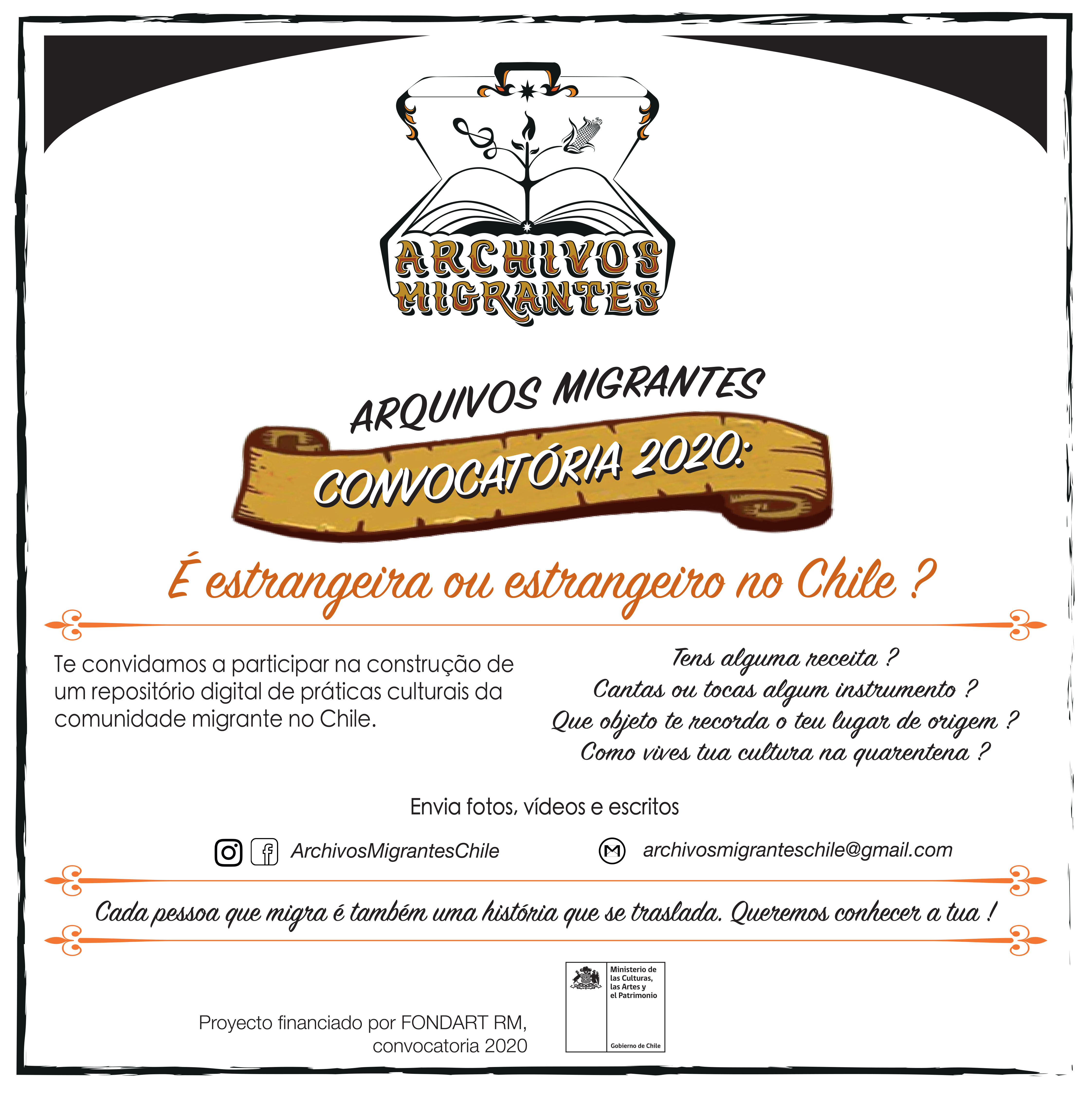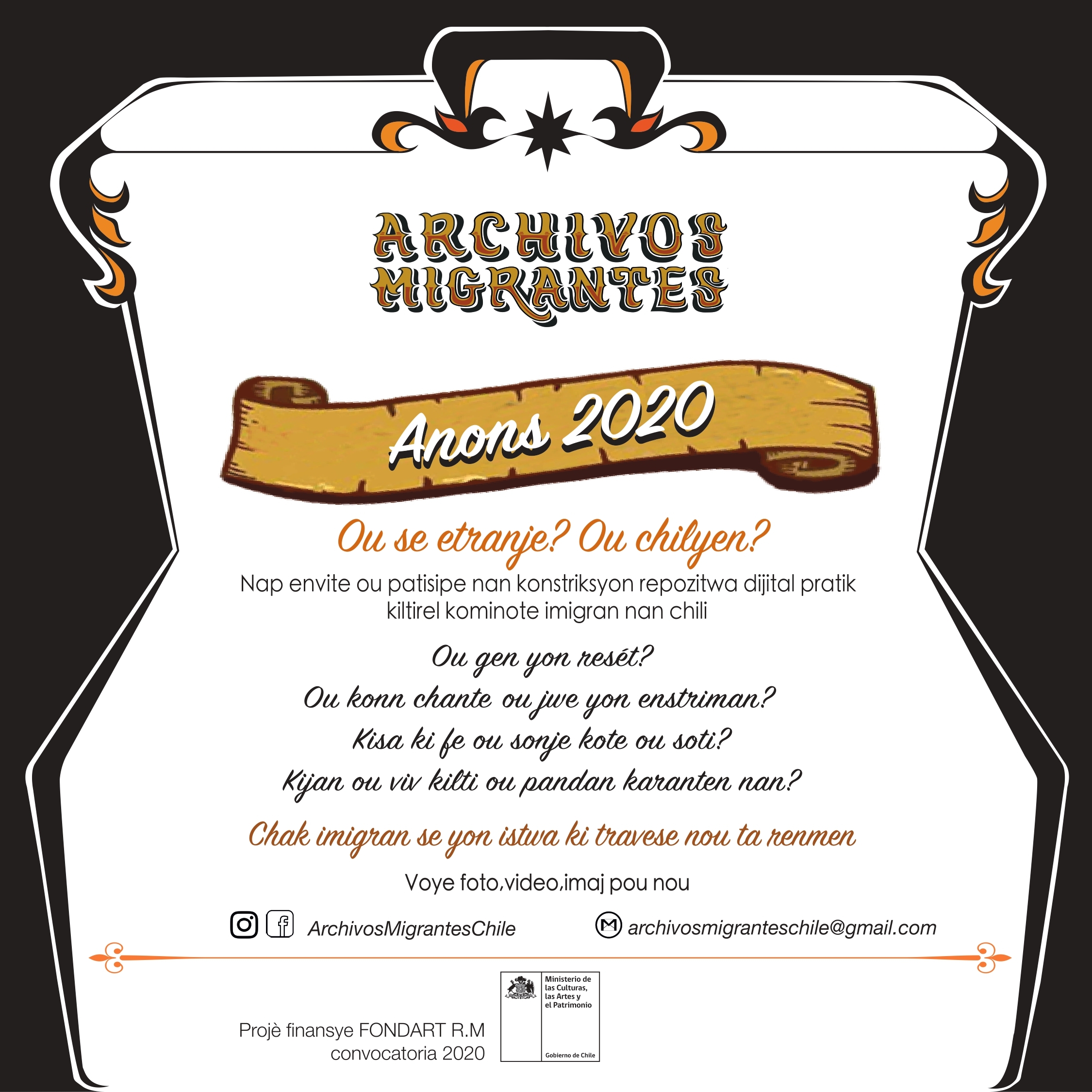 “Archivos Migrantes” es un proyecto que nació del encuentro de un grupo de mujeres de distintas profesiones y lugares de origen en torno al interés común de construir un repositorio de relatos, fotografías y videos, que dieran cuenta de las prácticas culturales y artísticas de las personas migrantes provenientes de países de Latinoamérica y el Caribe que han llegado a vivir a Chile, con el fin último de aportar a su difusión y puesta en valor. Con el lema “Cada persona que migra es una historia que se traslada. ¡Queremos conocer la tuya!” abrimos la invitación a compartir y establecer diálogos sobre las músicas, celebraciones, comidas, costumbres, bailes, objetos y todo aquello que, a pesar de la distancia física y del desarraigo, permite a estas comunidades conectar con sus orígenes.