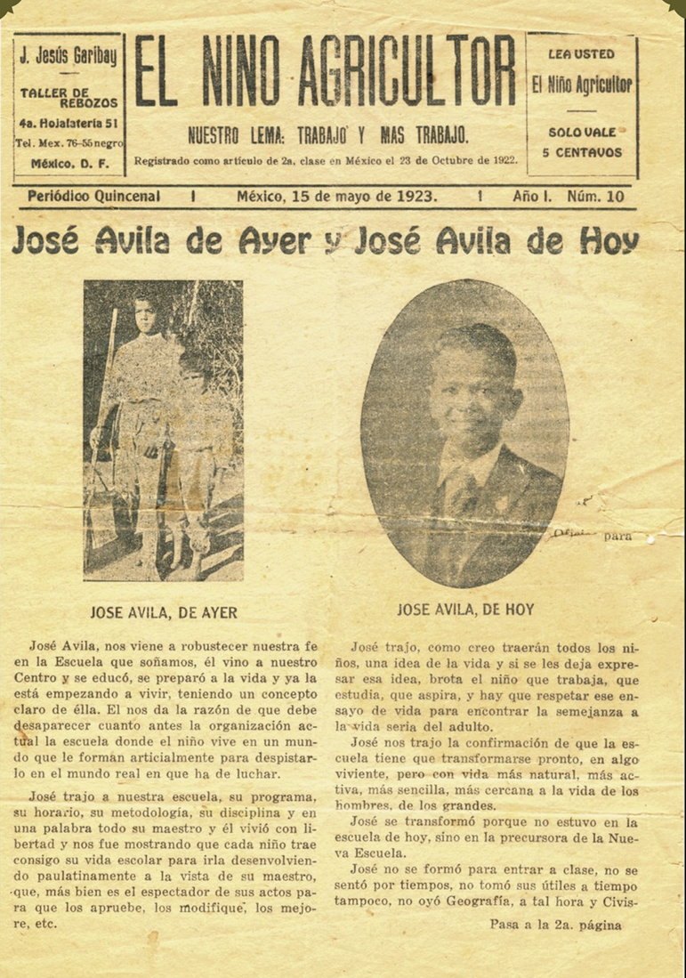 El desarrollo de la escuela-granja continuó ascendente y siguió el mismo derrotero de sus antecesoras de Yasnaïa Poliana y Shantiniketan. En octubre de 1922 al niño andrajoso que entró en 1920 —que ahora era el estudiante José Ávila Garibay— se le ocurrió fundar un periódico infantil que recogiera la experiencia de los niños agricultores, pero quiso hacerlo de la manera más formal posible y lo registró como “artículo de segunda clase” el 23 de octubre de 1922. El Niño agricultor era un periódico quincenal que alcanzó a editar poco más de 10 números hasta mayo de 1923. Con fotografías e ilustraciones contaba de 4 páginas y se vendía a 5 centavos y su lema era “trabajo y más trabajo”.53