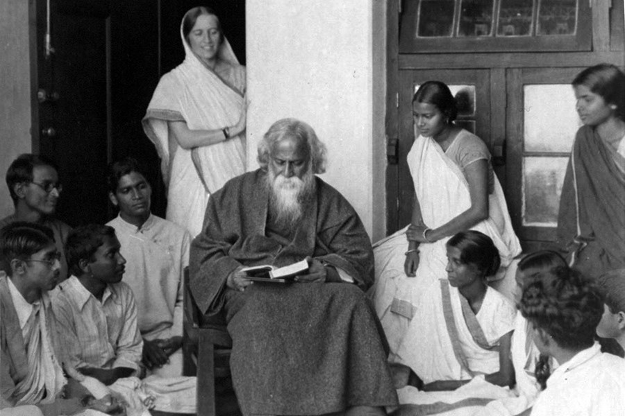 Tagore leyendo sus poemas a los estudiantes de Shantiniketan (fecha desconocida)