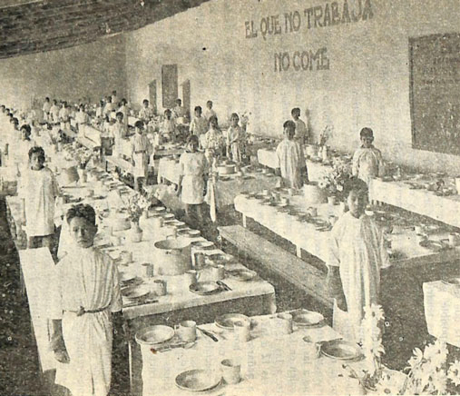 Brigada de meseros-alumnos en el comedor de la vieja escuela Francisco I. Madero