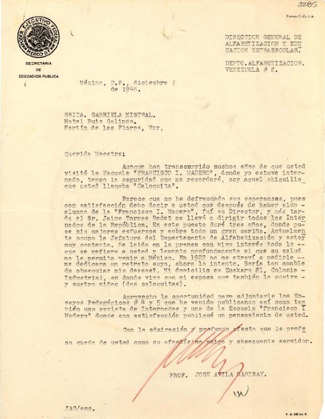Carta de José Ávila Garibay a Gabriela Mistral, Cuidad de México, diciembre de 1948