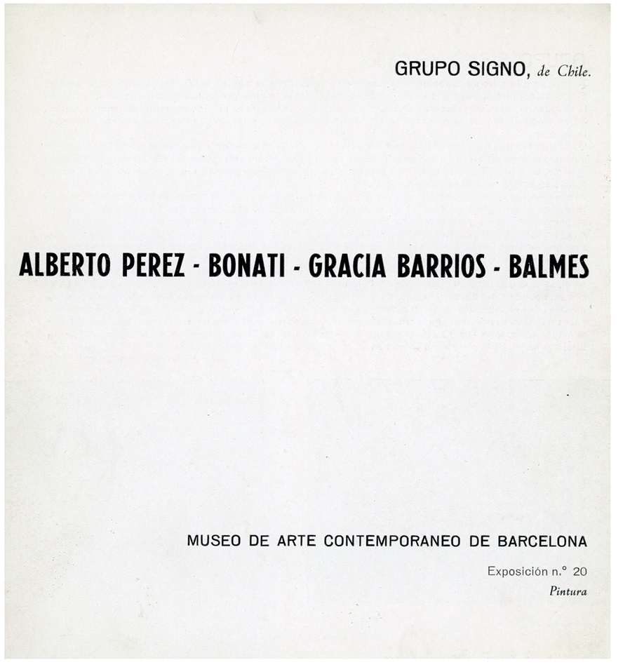 Archivo Balmes BarriosDestaca entre estas ediciones el catálogo de Madrid, en cuya portada se observa una composición visual realizada en tinta roja sobre fondo blanco que reproduce una anotación mínima de cada artista ―el número cuatro, “4”―, destacando por medio de este gesto pictórico coral la condición colectiva de la curatoría como suma de individualidades. En los catálogos de Cuatro pintores y Grupo Signo, de Chile, las portadas realzan el apellido de cada artista, conservando su identidad singular pese al esfuerzo curatorial de su reunión. Es evidente que estas operaciones editoriales intensificaron la presencia de ciertas ideas y estéticas pictóricas modernas que buscaron complejizar y politizar a las obras de arte abstracto que acompañaron, facilitando a través de la fotografía y el ensayo crítico una diversidad de significados que aparecían insinuados apenas en las pinturas exhibidas.