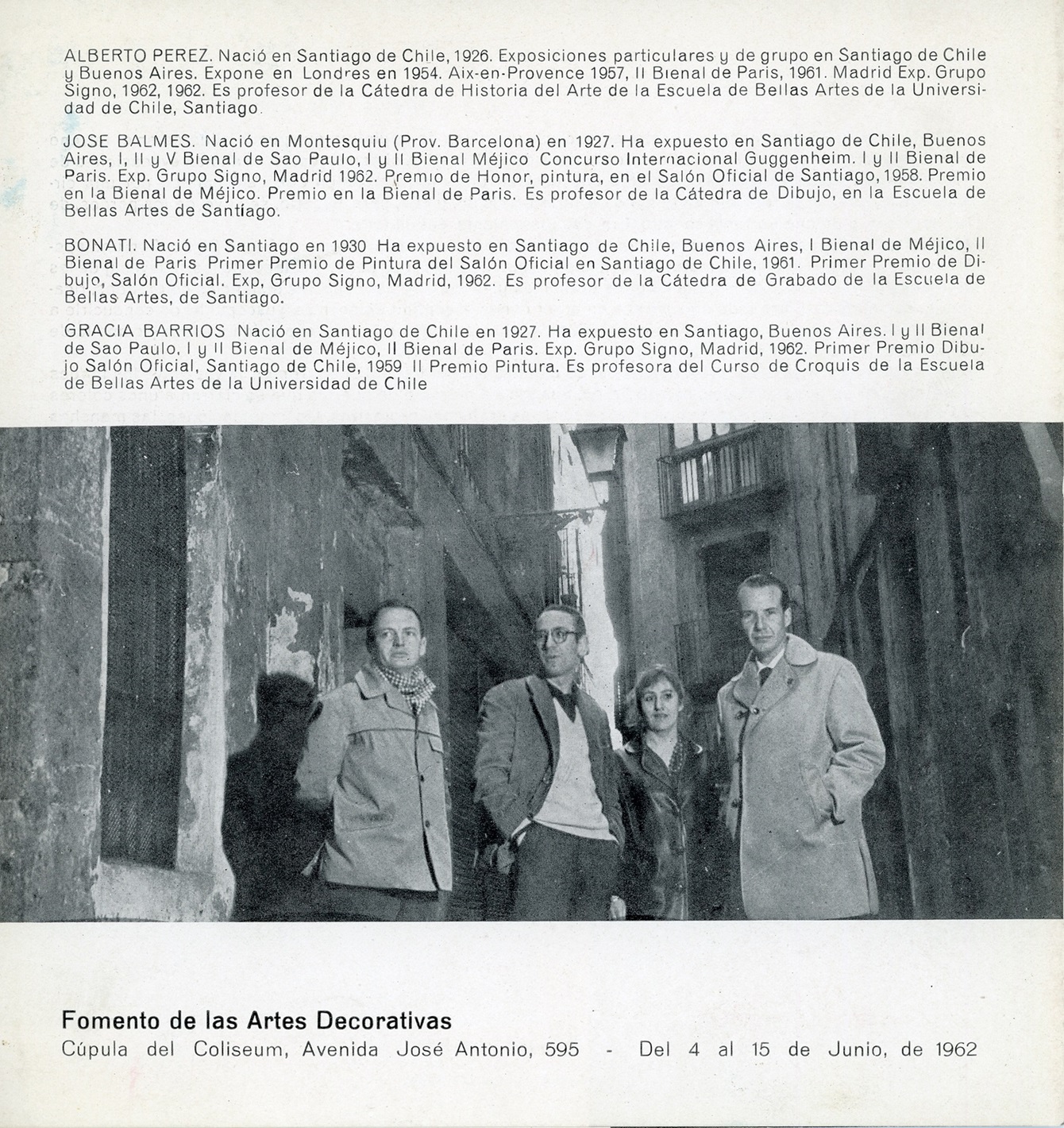 De esta travesía del colectivo de vanguardia por España se conservan los catálogos las exposiciones Cuatro pintores: Barrios, Bonati, Pérez, Balmes en el IEAP (1961), preámbulo de la gira ibérica; Cuatro Pintores de Chile en Galería Darro (Madrid, 1962), primera exposición del grupo en España y su “partida de bautismo” editorial y curatorial; y Grupo Signo, de Chile en el Museo de Arte Contemporáneo de Barcelona (1962), que es su presentación en sociedad como agrupación de vanguardia pictórica, con un nombre y una visión estético-política en común, elementos que van a perfilar a Signo como un movimiento de vanguardia con pasaporte mundial al retornar a Chile.18 La cuidada edición de cada uno de estos catálogos da cuenta de la visión modernizante de la agrupación en términos plásticos, y de Balmes como gestor protagónico de la gira y la visión curatorial. Todas estas ediciones incluyen retratos fotográficos en blanco y negro del grupo en diferentes emplazamientos urbanos, ya sea en el taller del escultor Sergio Mallol en barrio Bellavista (fotografías de Sergio Mallol), en el Barrio Gótico de Barcelona, o en la intimidad individual de cada uno de sus talleres, extendiendo el significado de las obras en la propia presencia visual de sus creadores.