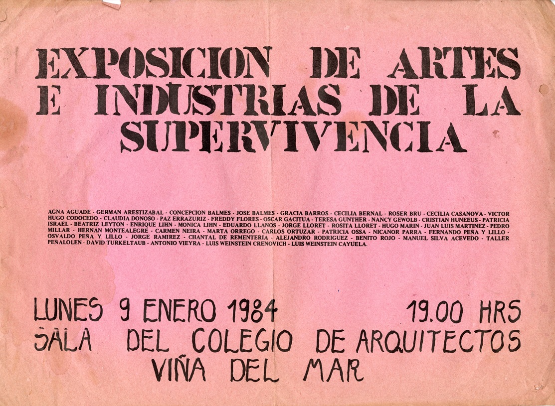 Como hemos destacado, Balmes continuó viajando y gestionando proyectos como académico de la Universidad de París I Panteón Sorbona y de la Universidad Católica de Chile,29 al mismo tiempo que formó parte activa del gran movimiento cultural e intelectual por el retorno de la democracia y el fin a los crímenes de lesa humanidad en Chile. Un espacio crítico integrado por artistas de distintas generaciones, que posibilitó la articulación de múltiples proyectos nacionales e internacionales de carácter contracultural y de denuncia, en los que la familia Balmes Barrios tuvo una presencia relevante, que en el caso de José Balmes se tradujo en la producción de diversas obras gráficas y acciones de arte en vivo. Un ejemplo de este tipo de eventos es la Exposición de artes e industrias de la supervivencia, realizada en la Sala del Colegio de Arquitectos Viña del Mar en 1984: una curatoría crítica de la cual participaron Balmes, Barrios y Concepción Balmes junto a más de 40 artistas de diversas trayectorias y disciplinas, entre ellos Claudia Donoso, Paz Errázuriz, Enrique Lihn, Hugo Marín, Patricia Israel y el Taller Peñalolén. Una copia del cartel que difundió este evento, de factura artesanal y escasa circulación, se conserva al interior de la serie de exposiciones del ABB. Otras exposiciones del mismo tipo fueron Chile ahora: testimonios de arte por una cultura libre y democrática (noviembre de 1983); Chile Demanda, organizada por la APECH, el Coordinador de Gremios de Arte (CGA) y el Colegio Médico de Chile en 1986; Homenaje de la Asociación de Pintores y Escultores de Chile a Santiago Nattino Allende (Galería Bucchi, 1986); y el Festival Chile Crea. Encuentro internacional de Arte, Ciencia y Cultura por la Democracia en Chile en julio de 1988, en el contexto del plebiscito de ese año. Este último evento, organizado por el colectivo CHILE CREA, la APECH y la Sociedad de Escritores de Chile (SECH) tuvo exposiciones simultáneas en la Casa del Escritor, la Galería Enrico Bucci, la Galería Lawrence, la Galería Taller 619, la Galería Carmen Waugh y el Instituto León Prado, anticipando la acción “expansiva” que Balmes va a desarrollar en algunas de sus exposiciones individuales. En esta etapa, el matrimonio de artistas expuso también en conjunto en algunas curadurías bipersonales y colectivas que abordaban metafóricamente su vivencia del exilio, o realizaban una crítica oblicua a la represión política, como Estos dibujos al volver comisariada por Carmen Waugh (Restaurante Altazor, 1982) y Treinta años después en Galería Carmen Waugh (1985).