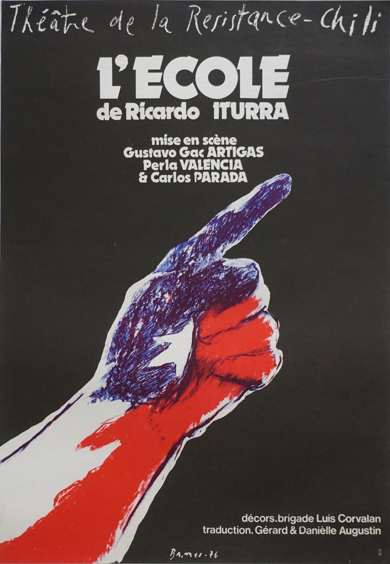 Archivo Balmes Barrios.Los imaginarios de resistencia y horror presentes en la obra pictórica de Balmes durante el periodo comprendido entre 1973 y 1984 se desarrollaron también en una enorme cantidad de series gráficas políticas y creativas. Hacemos esta distinción pues este grupo de trabajos comprende tanto a su obra gráfica, como a los carteles políticos y publicitarios realizados por el artista en apoyo a actividades y proyectos de izquierda chilena en el país y el mundo. Ejemplos de este tipo de obras son la serie gráfica Imaginario del Canto General de Pablo Neruda (iniciada en 1972, pero proseguida en años siguientes en la serie Gritos, 1973-1977), y los carteles realizados para el documental Yo fui, yo soy, yo seré de Walter Heynowski y Gerhard Scheumann (1974); y para la obra La Escuela de Ricardo Iturra, realizada por el Teatro Chileno de la Resistencia en París (1976), creaciones que indagaron en torno al golpe de Estado y la dictadura en Chile. Estas obras cartelísticas fueron realizadas en paralelo a sus significativas series pictóricas Caídos (1973-1986), El Silencio (1977), Noticias (1980), Défense d'afficher” (1982) y Desechos (1983-1986), que dan cuenta de una identidad artística sustentada en el diálogo con la gráfica política, el fotoperiodismo y las formas propias de la cultura de masas, como las impersonales letras de molde y las formas familiares de una pila de desechos apilados en cualquier esquina de la ciudad.