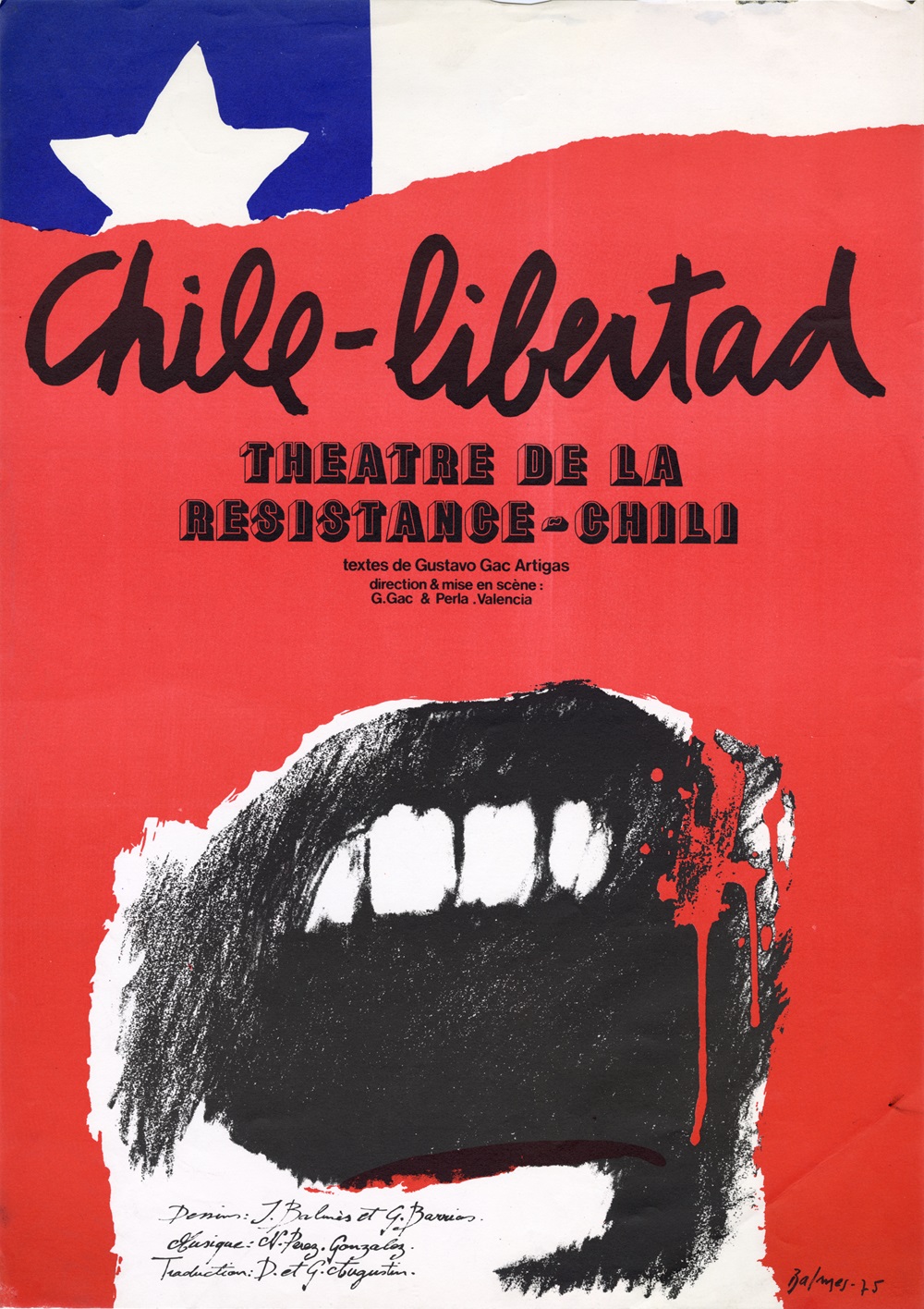 Archivo Balmes Barrios.Cartel del montaje Chile-libertad del Teatro de la Resistencia - Chile, 1975. Reproduce una imagen de la serie Imaginario del canto general.